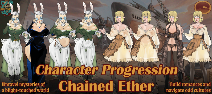 We combine this with ship's officers that you can recruit to provide some gameplay bonuses to your ship, but who are also deep characters with their own backstories, motivations, personalities, and potential relationships with the captain (player character). You'll start out knowing Samantha, an innocent childhood friend who happens to be your chief engineer who is finally beginning to acknowledge her femininity. We already have 6 other characters with personalities, stories, and a ton of art; multiple outfits with variations for pregnancy and post-pregnancy bodies, sex scenes, and more. In fact, our artist has been making art for this game for nearly two years! We actually started planning and designing chained ether over 3 years ago.